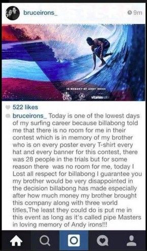 “Aujourd’hui est l’un des pires jours de ma carrière de surfeur car Billabong m’a dit qu’il n’y n’avait pas de place pour moi dans leur contest qui est pourtant en mémoire de mon frère. Il y avait 28 surfeurs dans les trials (32 en fait, ndlr) mais, pour certaines raisons, pas de place pour moi”, lâche un Bruce Irons amer dans un post sur son compte Instagram, depuis retiré. Il est vrai que l’absence du Pipe Masters 2001 parmi les trialistes dûment sélectionnés (les 16 meilleurs hawaiiens du Volcom Pipe, les 5 meilleurs hawaiiens au classement WQS, les 5 meilleurs hawaiiens au classement régional et 6 wild-cards -4 pour Billabong, 2 pour Vans) pouvait surprendre.
