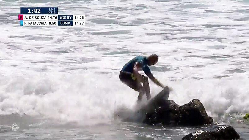 On est pas bien là ? Car ce n’est pas fini ! Trois séries plus tard, Fred Pataccchia s’incline face à Adriano de Souza avec un score qui parle de lui-même : 14,76 contre 1,13. Dégoûté, l’Hawaïen sort de l’eau en pompant sur une « miose » et vient terminer sa vague sur les rochers, fracassant sa planche. Il rentre sur le site en vociférant des noms d’oiseaux et se casse direct dans son appart avec son lycra de compétition sur le dos. Heureusement, la pression est vite retombée et Freddy s’amuse même de son trick sur les rocks, lançant un concours sur Instagram : « La meilleure photo prise sur Freddy’s Rock remporte une planche ». Stephen Bell et Jake Paterson jouent le jeu, toujours partant pour une connerie et une bonne façon pour Quiksilver de désamorcer la polémique éventuelle.