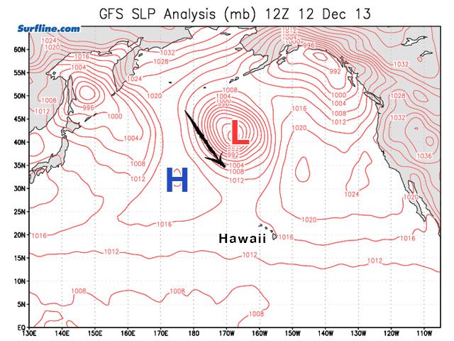 Kevin Wallis (d’après son analyse sur Surfline) : “Depuis quelques jours, nous suivons une dépression qui se déplacent lentement vers le nord-est et dont le centre est aujourd’hui situé à environ 2000 km au nord-ouest d’Hawai’i. Cette dépression ressemble beaucoup à celle de Thanksgiving et on devrait donc avoir deux houles assez identiques. Cette très grosse houle de nord-ouest va rapidement grossir vendredi après-midi et dans la soirée sur le North Shore d’Oahu et atteindre sa taille maximale tôt samedi matin. Tout indique que cette houle sera aussi puissante que celle du Black Friday : même taille de houle en haute mer, même période (10 à 12 pieds à 16 secondes), avec, dans ce cas, une houle orienté juste un peu plus nord (320° contre 310 à celle du Black Friday).