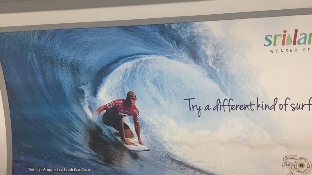 « Ca fait longtemps que je n’ai pas surfé A Bay, mais au regard de cette affiche du bureau du tourisme du Sri Lanka, le reef doit avoir changé et la vague est bien plus creuse. D’autant que Fanning se débrouille plutôt bien en switch.