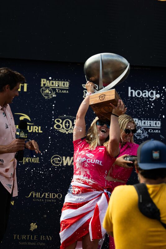 J’étais sur place quand c’est arrivé et j’en ai des frissons rien que d’y repenser. Pour ma part, j’aime capter l’énergie des gens et sentir qui va gagner, un peu par intuition. Pour Steph, il y a quelque chose en elle que je perçois et qui me permet de dire “elle est lancée« . Il y avait quelque chose de spécial à propos de cette journée, son équipe voyait des 8, des 88 partout, il y avait de la manifestation dans l’air et la chance était de son côté. Je l’ai réalisé dans son premier heat : il y a eu un dernier échange de vague qui a été en son sens et on a pu voir quelque chose se passer, j’ai vu que quelque chose s’était apaisé en elle. À chaque heat elle avait l’air de plus en plus à l’aise et je me suis dis “elle va être très dure à battre”.