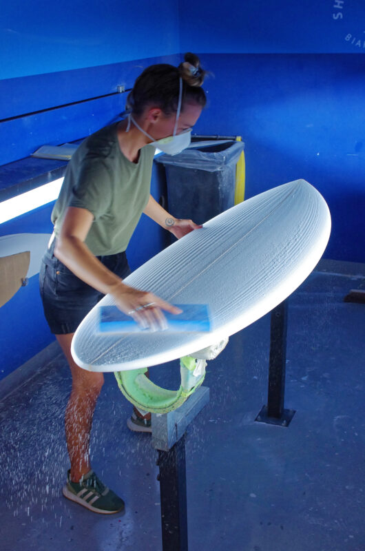 Valérie Duprat – J’ai commencé à shaper il y a peut-être maintenant 12 ans, totalement pas hasard pour le fun. Ici c’est très accessible parce qu’il y a des magasins qui te vendent des blanks, tu peux en acheter et en faire dans ton jardin. Je m’y suis mise comme un hobby, une passion à moi. Ma première planche était un shortboard parce que je me suis dit que ce serait plus facile, qu’avec moins de volume j’aurais aussi moins de travail à faire. J’avais un peu raison à ce sujet, physiquement c’était plus facile.