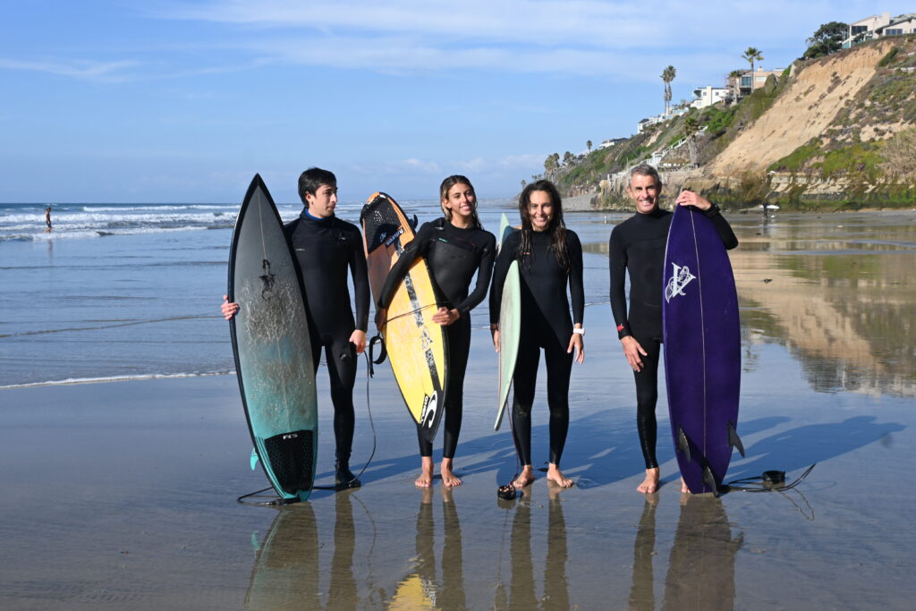 Non, c’est complètement venu de mon mari. J’ai grandi en banlieue parisienne donc l’océan pour moi c’était une semaine à Lacanau par an. Je n’avais aucune connaissance de la mer et je n’ai pas grandi à l’océan. Plus tard dans mon adolescence, je me suis tournée vers le snowboard. J’ai passé du temps à la montagne, j’ai fait de la compétition en slalom et j’étais accro à ça. Sauf que j’ai rencontré mon mari à Bordeaux, où je faisais ma thèse de biochimie, et lui ne pouvait pas vivre loin de l’océan. Il surfe depuis ses 14 ans. Avec les études j’avais prévu de partir aux Etats-Unis et donc j’ai postulé uniquement en Californie (San Francisco, Los Angeles, San Diego). On a tout de suite accroché avec San Diego et j’ai accepté le contrat dès qu’on me l’a proposé. C’est comme ça qu’on a déménagé, pour l’aventure américaine, et on s’est créé notre petite vie ici, maintenant avec nos deux enfants.