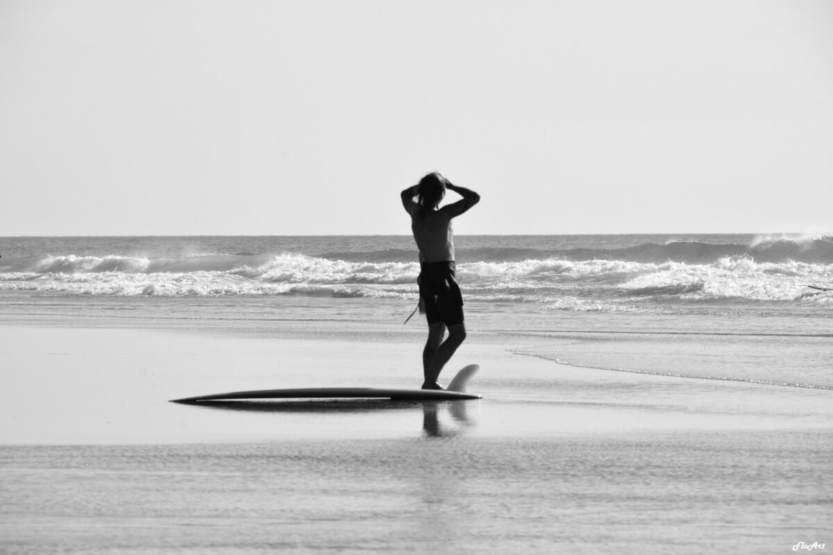 Louis se saisit de son semi-gun Grunt de chez Bradley, une 7’6 shapée pour s’attaquer à des vagues de 2m50 à 4m, recouverte des poissons de Manu pour surfer la Nord quand c’est gros. « C’est une planche idéale pour la Nord. Je ne l’ai pas encore essayée sur d’autres spots mais elle conviendrait parfaitement pour des vagues plus grosses comme Mundaka ou même en Irlande » explique Louis, sensible au travail de sa mère. « Depuis mon enfance, ma mère m’a toujours fait part de ses projets artistiques. Je la soutiens et je l’encourage dans ses idées car j’admire énormément son talent créatif. Une belle décoration sur une planche peut la rendre unique et je pense avoir réussi à le faire avec ma mère et l’équipe de bellsurfing sur mon semi-gun. »
