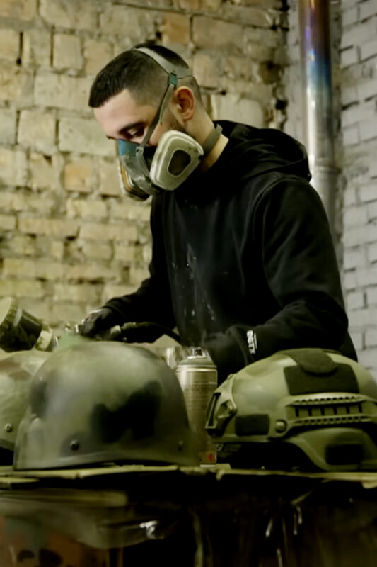 Une fois la surface lissée, j’ai pu penser à imaginer le rendu final en venant au masquage. C’est l’étape où l’on place les scotchs délimitant les zones où la couleur sera placée. Cette étape vient avec le plaisir de pouvoir exprimer sa créativité, en imaginant une ou plusieurs couleur et une disposition de ces dernières 100% personnalisée, à son image. Les lumières latérales et rasantes de la salle de shape se rendent ici très utiles, car ce sont les ombres formées sur la planche qui permettent de guider la pose du scotch le plus droit possible. Le geste est technique et doit se faire de façon fluide, en utilisant ses deux mains (l’une tire, l’autre colle). À nouveau, Vadim me montre la marche à suivre et s’assure que j’y parvienne ensuite par moi-même. Je colle deux scotchs, un premier bien collant et solide qui marquera une limite claire, puis un second plus souple (qu’on ne rabat pas) et sur lequel la résine coulera vers le sol (et non sur l’autre face de la planche).