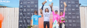La longboardeuse et le shortboarder français s'imposent en Angleterre. Marco Mignot et Edouard Delpero montent également sur la boite.